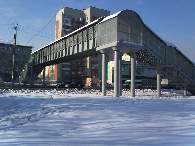 Мост и сходы покрыты светопрозрачным защитным сооружением с применением цветного прозрачного монолитного поликарбоната толщиной 4мм. Предусмотрено освещение моста и сходов в тёмное время суток.